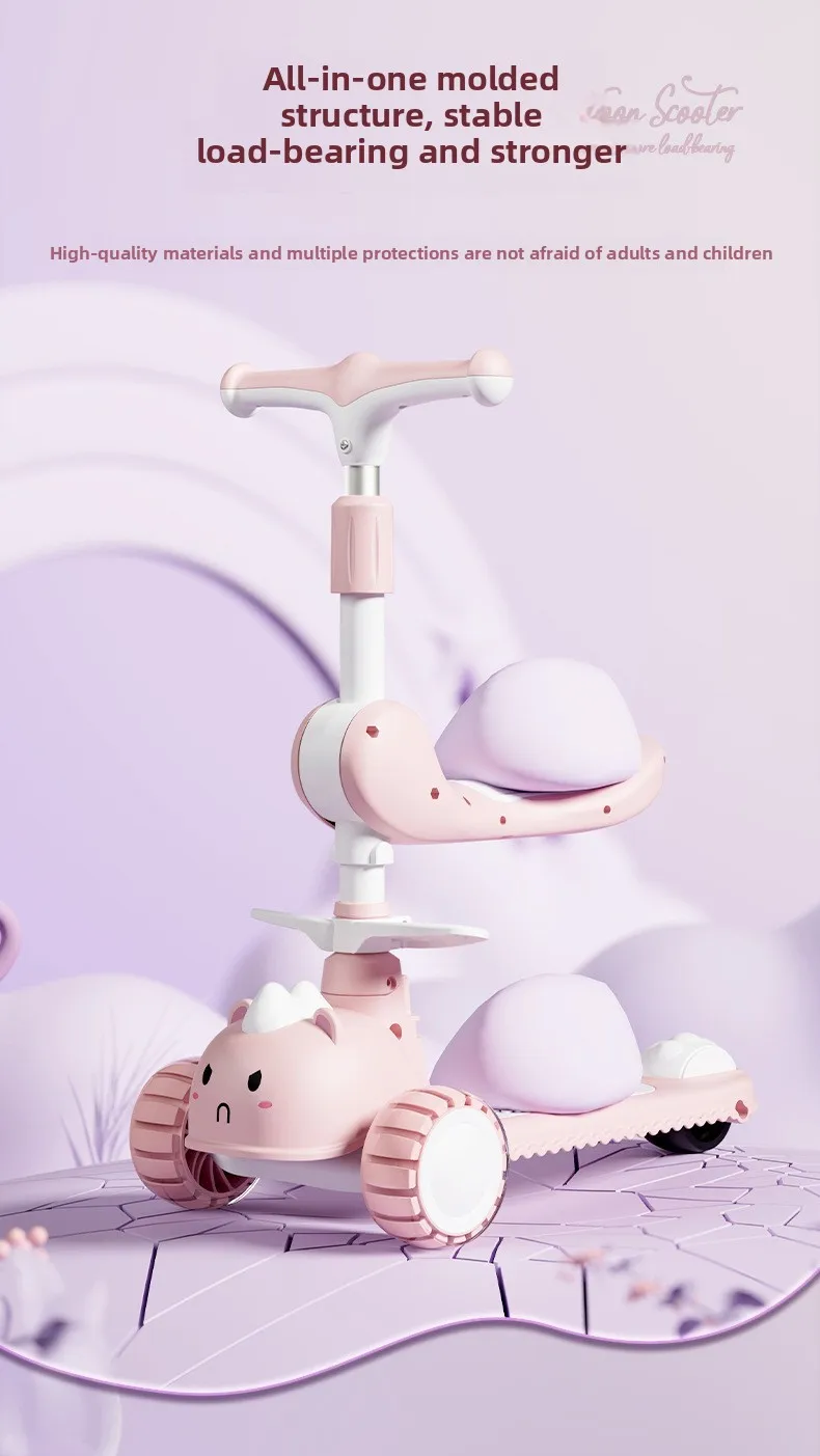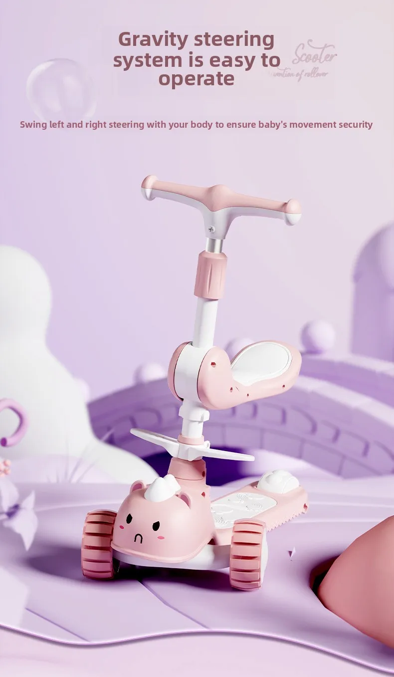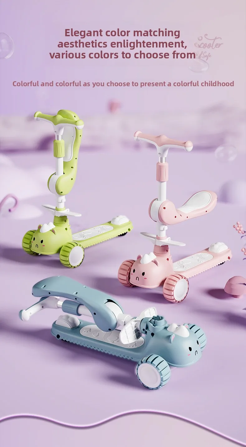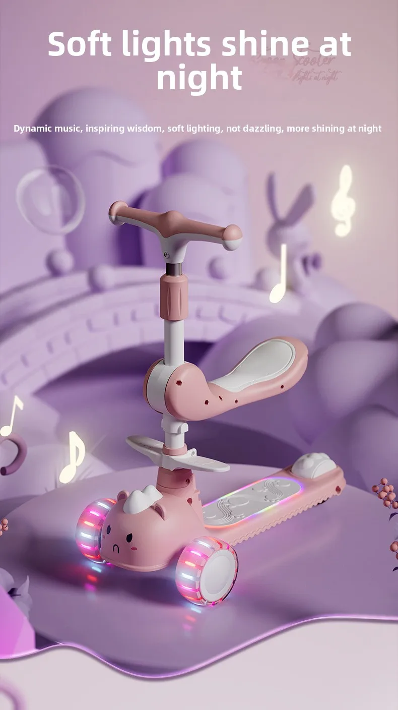 2-In-1 Children's Scooter Baby Kickboard 3 Height Adjustable 3-Wheel Music Light Foldable Micro Kcik Scooter Boy Girl Ages 2-10
