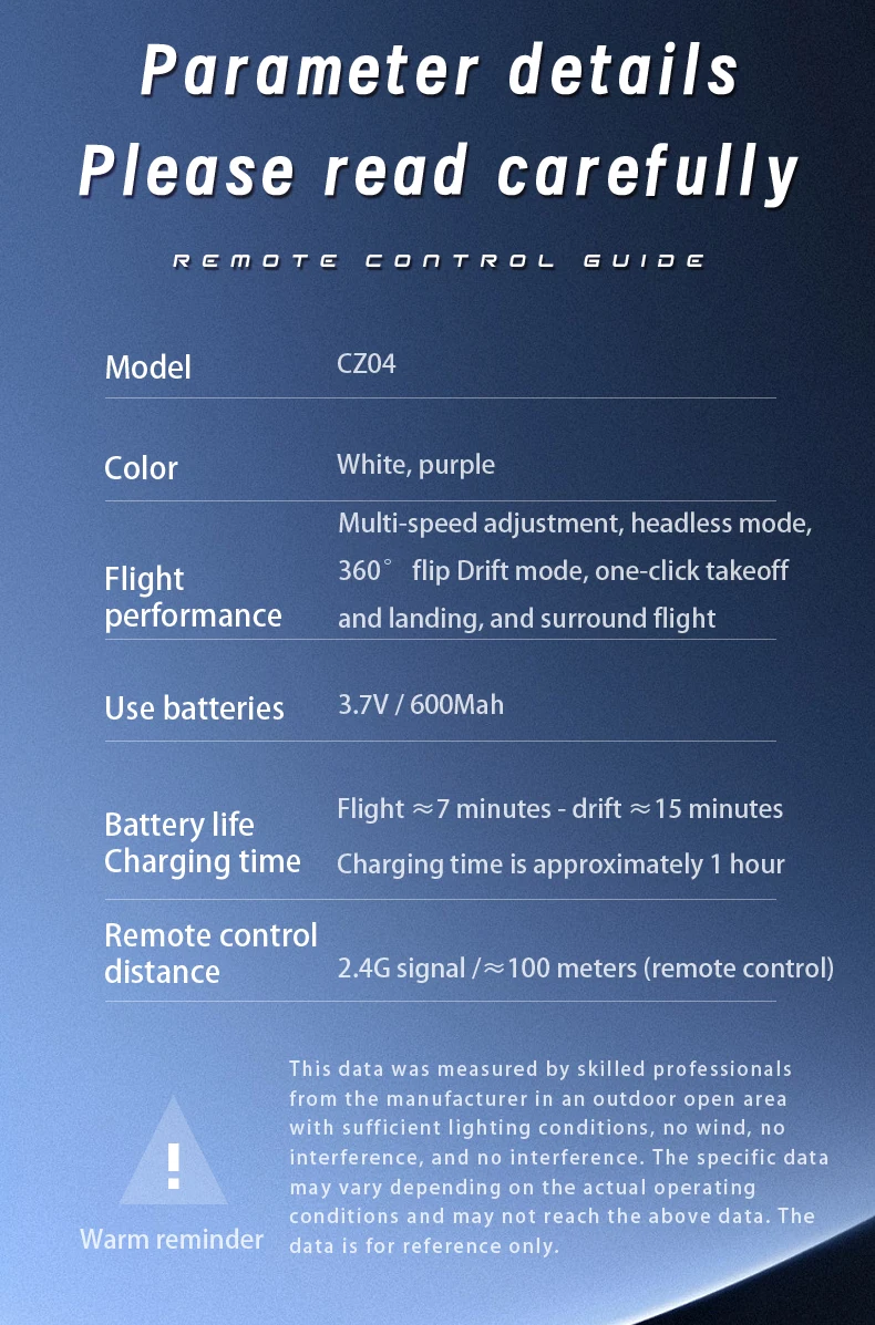 Flight performance : Multi-speed adjustment, headless mode, 360°flip Drift mode, one-click take off and landing, and surround flight
